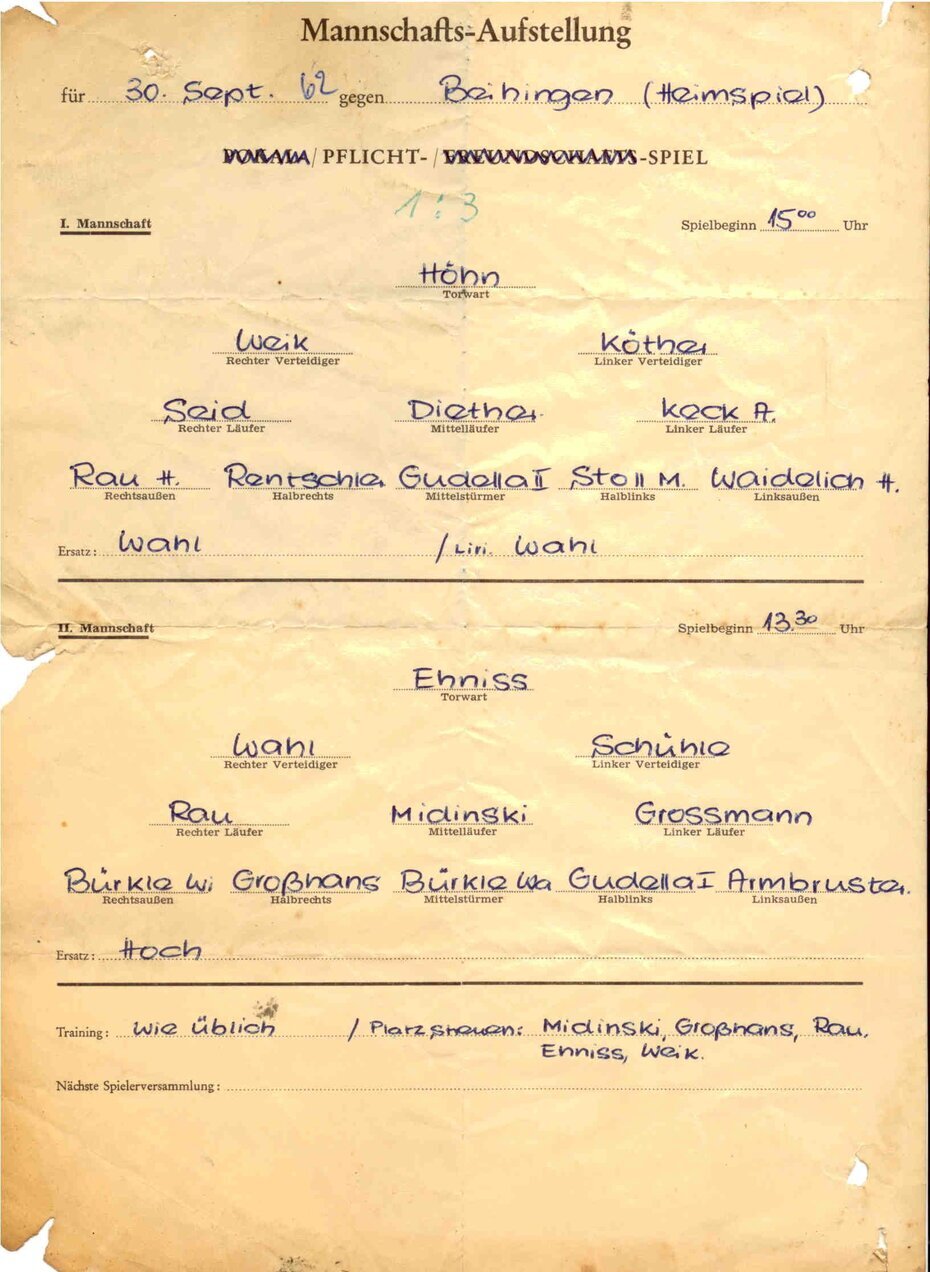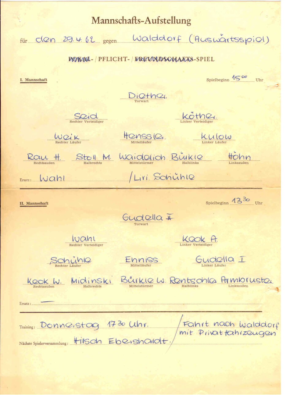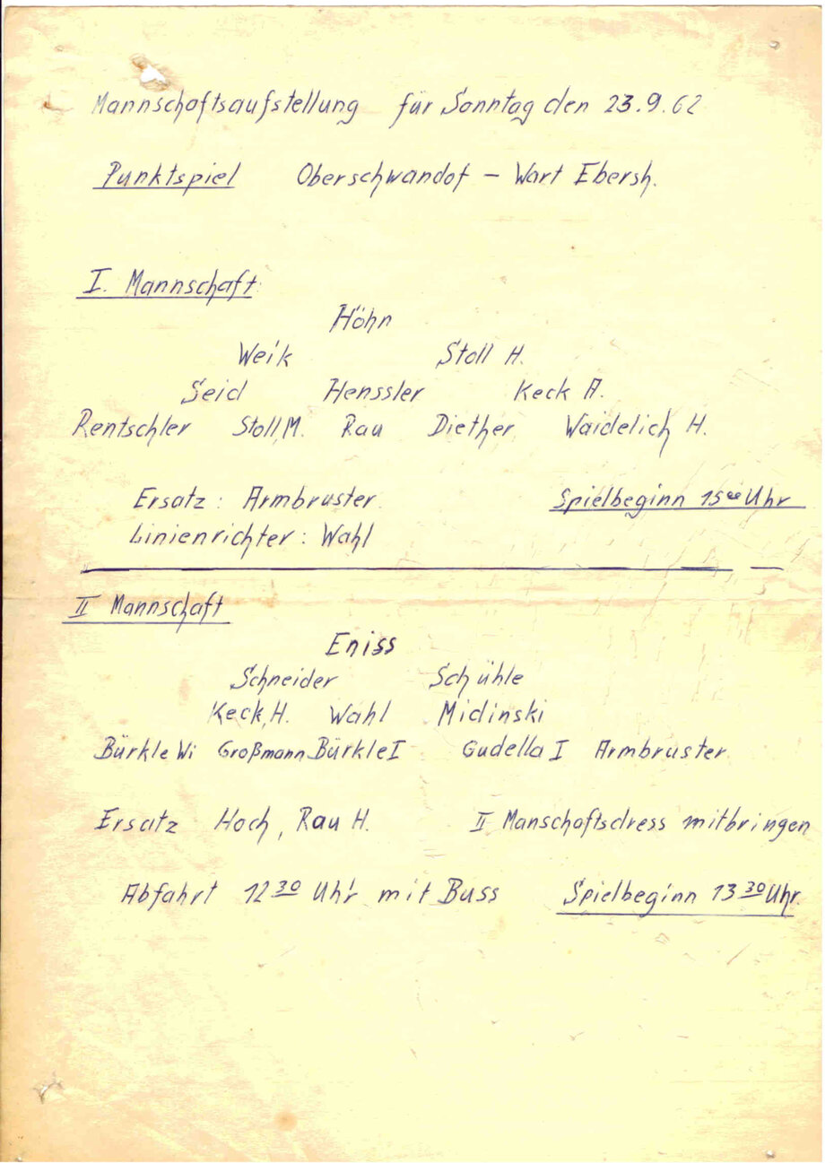 Nicht alle Warter Einwohner waren mit dieser Kickerei einverstanden. Auch gab es öfters Ärger mit der anliegenden Gaststätte „Linde“ der Anna Roller. Nachdem sich eines Abends ein Ball durch das gerade offen stehende Fenster in den Gastraum verirrte, ganz nebenbei die Theke abräumte, weiter durch die geöffnete Flurtüre segelte und schließlich im WC landete, machte sich nicht nur bei Anna Roller, sondern auch im Gemeinderat immer mehr die Stimmung breit: „Des Kigga em Flegga muaß uffhöra.“ Sollte diese Stimmung, also ein Verbot etwa der Anlass für eine Vereinsgründung sein? Ja, in Wart-Ebershardt war es so. Relativ rasch entstand die Idee, einen richtigen Fußball-Verein zu gründen. Um an Ligaspielen aber teilnehmen zu können, benötigte man einen Sportplatz, den man im Wendener Feld (Auffüllplatz) bauen wollte. Rudolf Volz spielte selbst nie Fußball. Doch er, Eugen Roller und Erich Hartmann waren die treibenden Kräfte, die den Verein gründen wollten. Je deutlicher eine Vereinsgründung Gestalt annahm, desto mehr wurden die drei „Gründungskräfte“ dann plötzlich auch von Bürgermeister Pammersberger und den Gemeinde-Vätern unterstützt.